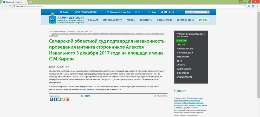 Мэрия Самары опубликовала на своем сайте неверное решение Самарского областного суда о том, что отказ властей согласовать митинг-встречу с Алексеем Навальным признали законным. В действительности областной суд признал этот отказ необоснованным, лишь слегка изменив формулировку в решении суда первой инстанции.