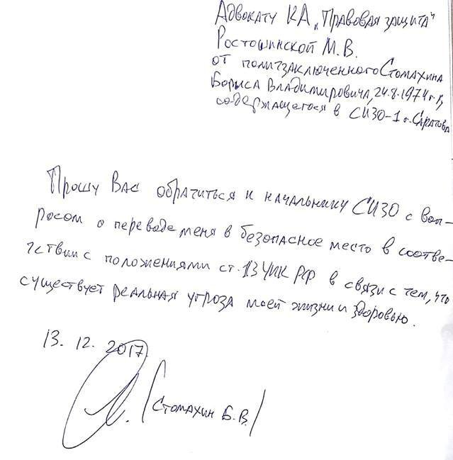 Во время встречи с адвокатом Маргаритой Ростошинской Стомахин заявил о существующей угрозе его жизни и здоровью и попросил перевести его в безопасное место. Стомахин находился в общей камере, где «арестанты требуют от него соблюдать воровские понятия: подчиняться смотрящему, участвовать в сборе общака и т. д.».