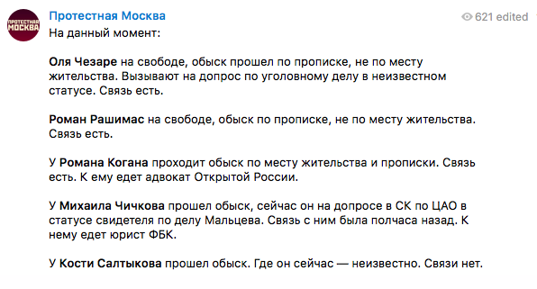UPD 12.36: В телеграм-канале «Протестной Москвы» пишут, что Михаила Чичкова отпустили из СК. У Романа Когана изъяли всю технику.