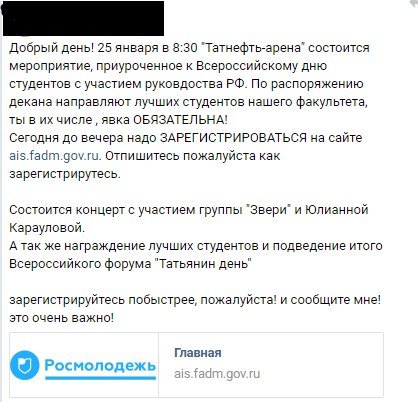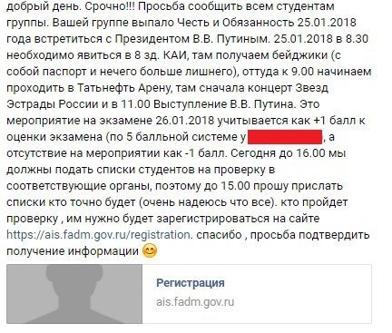 Кураторы и старосты групп спешно приглашают студентов прийти на встречу с президентом, при этом «явка обязательна». В переписке утверждается, что явка даст плюс один балл на одном из экзаменов, а отсутствие студента минус балл. После встречи состоится концерт.