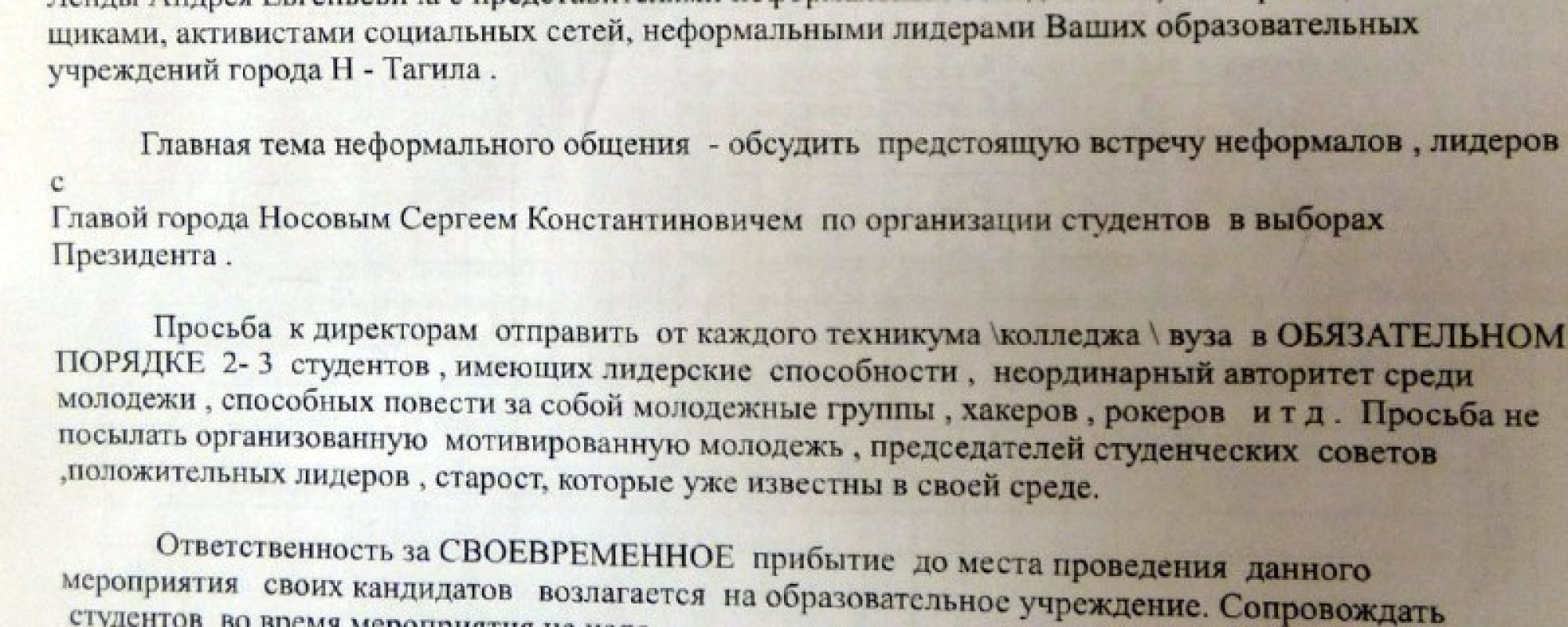 «Просьба к директорам отправить от каждого техникума\колледжа\вуза в ОБЯЗАТЕЛЬНОМ ПОРЯДКЕ 2–3 студентов, имеющих лидерские способности, неординарный авторитет среди молодежи, способных повести за собой молодежные группы, хакеров, рокеров и т. д. Просьба не посылать организованную мотивированную молодежь, председателей студенческих советов, положительных лидеров, старост, которые уже известны в своей среде. Ответственность за СВОЕВРЕМЕННОЕ прибытие до места проведения данного мероприятия своих кандидатов возлагается на образовательное учреждение. Сопровождать студентов во время мероприятия не надо. Постаралась осветить инициативу Администрации города — поднять молодежь на выборы любой ценой», — говорится в документе.