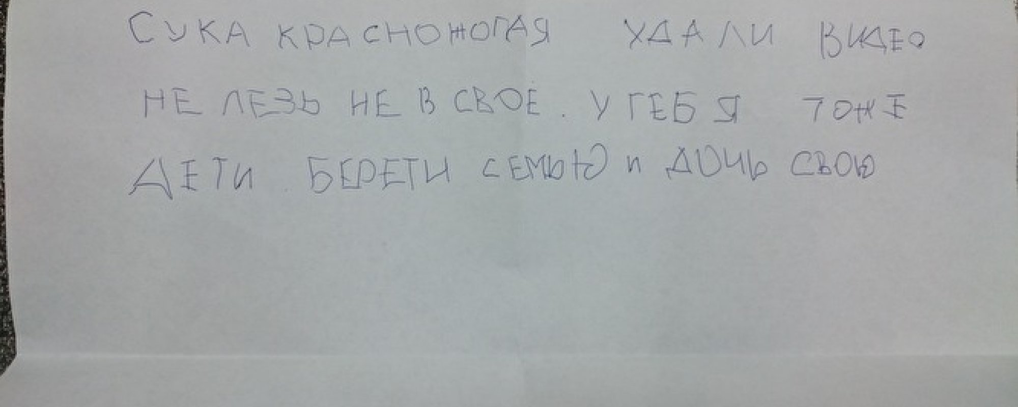«Сука красножопая, удали видео, не лезь не в свое. У тебя тоже дети, береги семью и дочь свою», — написано в послании.