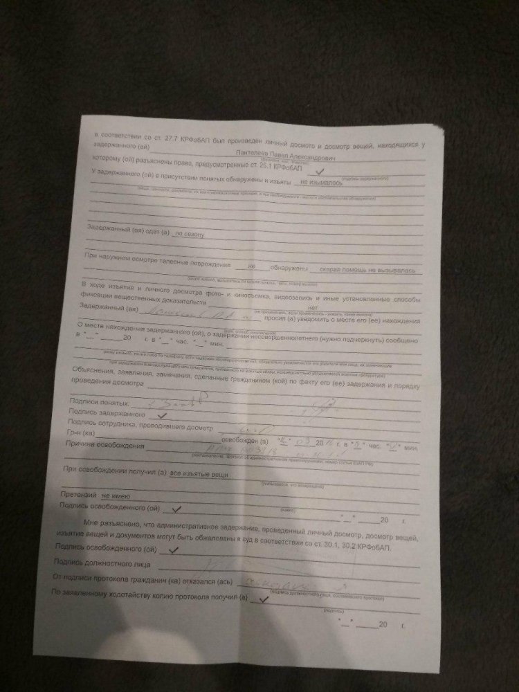UPD 17.03 13:55 После 15:00 16 марта Павел Пантелеев вышел из отдела полиции, сообщил Александр Литреев. На него составили протокол о мелком хулиганстве (ст. 20.1 КоАП) и оштрафовали на 500 рублей. Информация о том, что к Пантелееву приходили родители, не подтвердилась — Литреев сообщил со слов активиста, что родители находятся в Перми.