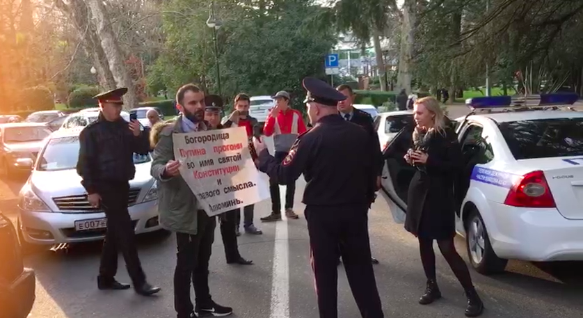В Сочи полиция задержала члена УИК Валерия Туаева, когда он стоял в одиночном пикете с плакатом «Богородица Путина прогони во имя святой Конституции и здравого смысла. Алюминь». Об этом ОВД-Инфо сообщил Вадим Пеликанов, который увидел задержание и заснял его на камеру.