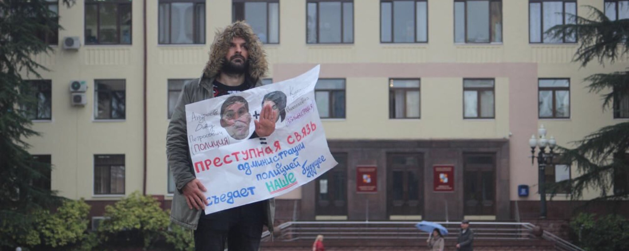 В Сочи на активиста Валерия Туаева напали, когда он стоял на одиночном пикете с плакатом с надписью «Преступная связь администрации с полицией съедает наше будущее». Об этом он сам сообщил ОВД-Инфо.