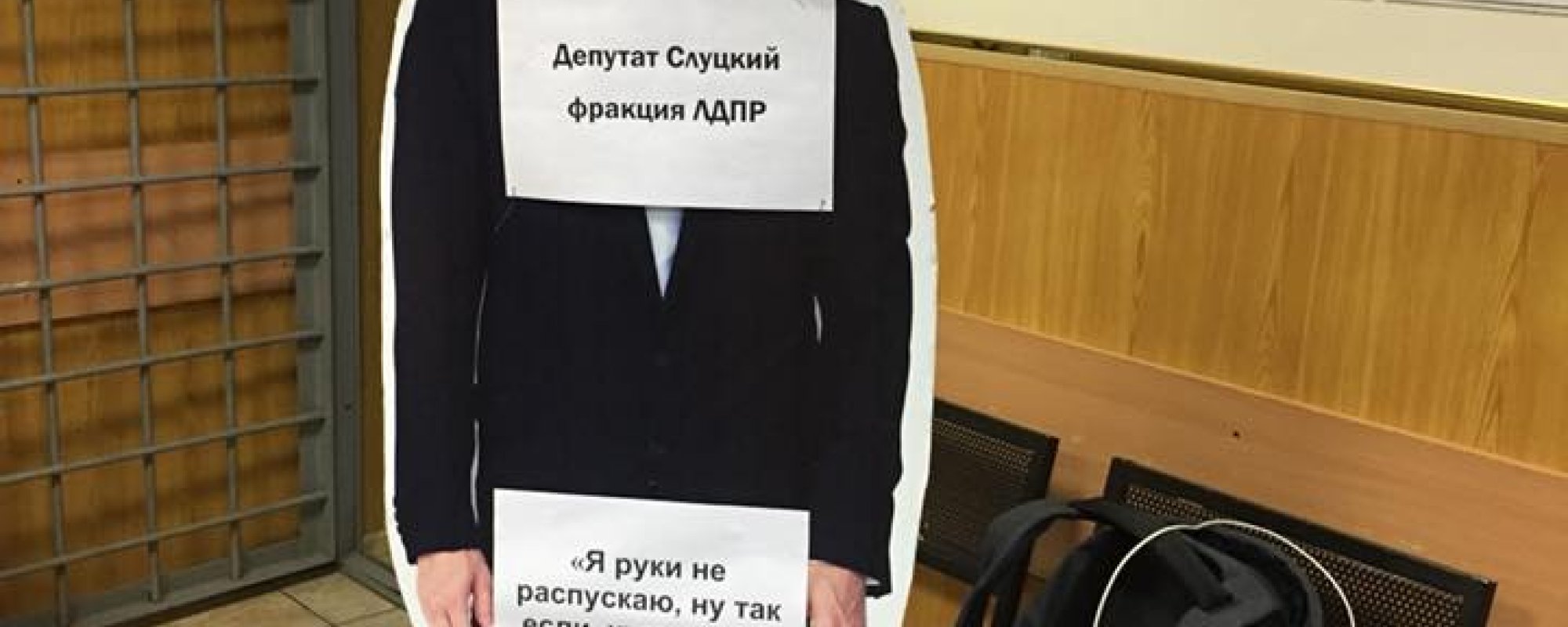 Попова стояла с картонной фигурой Слуцкого и написанной на нем фразой депутата «Я руки не распускаю, ну так если, чуть-чуть…» Как написала сама активистка в фейсбуке, полиция посчитала фигуру сборно-разборной конструкцией.
