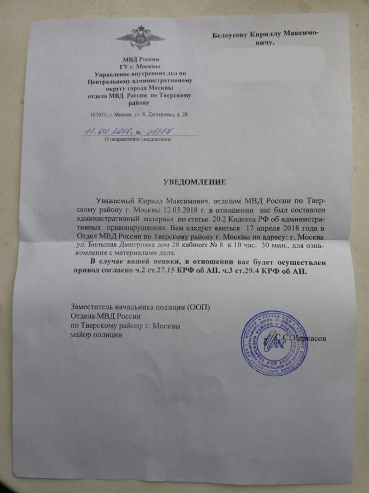 А сегодня Белоусову пришло уведомление о том, что завтра он обязан явиться в отдел полиции «Тверской» для ознакомления с этими самыми исправлениями в деле. В документе говорится, что иначе ему угрожает принудительный привод.