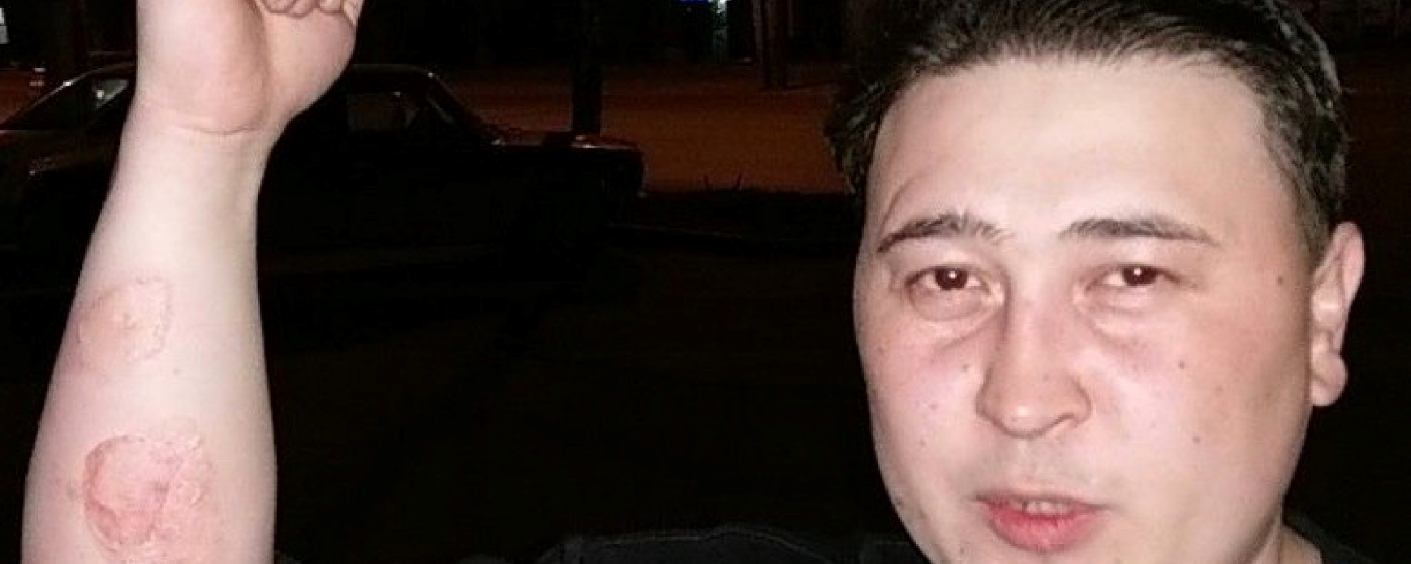 «Самый кошмар был в машине. Я лежал между задним и передним сиденьем, на меня сложили ноги. Они намеренно включили печку под передними сиденьями, хотя было 3–4 часа дня, 18. Они это сделали специально, чтобы мне было плохо дышать, и если бы я руку не поставил к печке, у меня бочина бы вся сгорела. Я говорил: „Ребята, дышать нечем“. Они пинают, говорят — „Ты живой там? Потерпи, братан, щас приедем, все нормально будет“. Еще били по левому боку. Когда долго на вопросы не отвечал — просто так били, потому что, видимо, им понравилось».