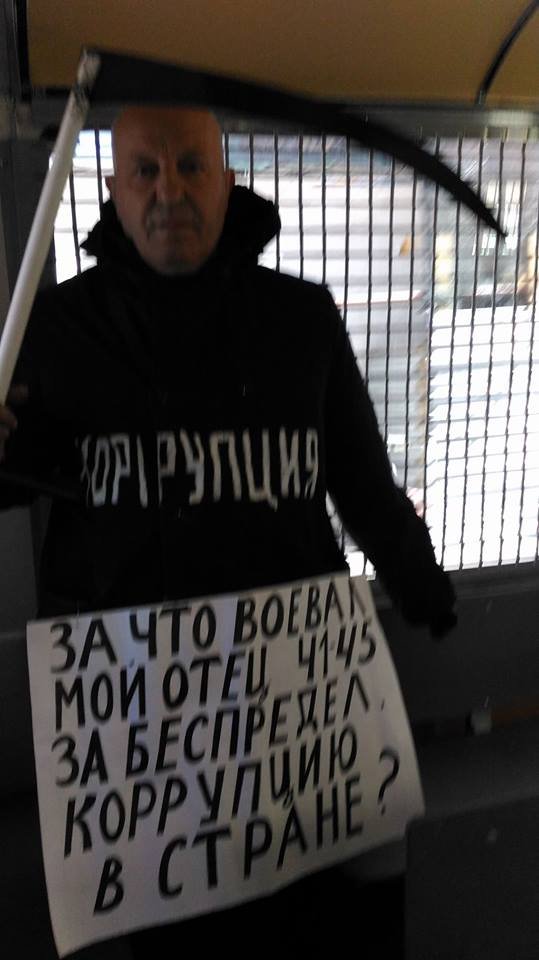 Цатуров вышел на акцию с бутафорской косой, в халате с надписью «коррупция» и плакатом, на котором было написано: «За что воевал мой отец 41–45. За беспредел, коррупцию в стране?».