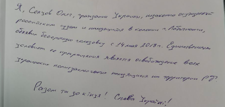 «Я, Сенцов Олег, гражданин Украины, незаконно осужденный российским судом и находящийся в колонии города Лабытнанги, объявляю бессрочную голодовку с 14 мая 2018 года. Единственным условием ее прекращения является освобождение всех украинских политзаключенных, находящихся на территории РФ», — такую записку передал Олег Сенцов через адвоката.