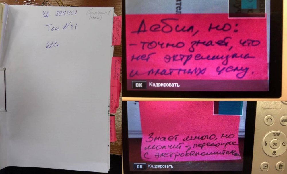 Адвокат Анастасии Терентьевой Александр Мелешко 19 июня обнаружил на материалах дела, полученных для ознакомления, стикеры с пометками: «Знает много, но молчит — передопрос с электровспоминателем», «Дебил, но точно знает, что нет экстремизма и платных услуг», «Нет связи с СЦМ — ДОПРОСИТЬ еще».