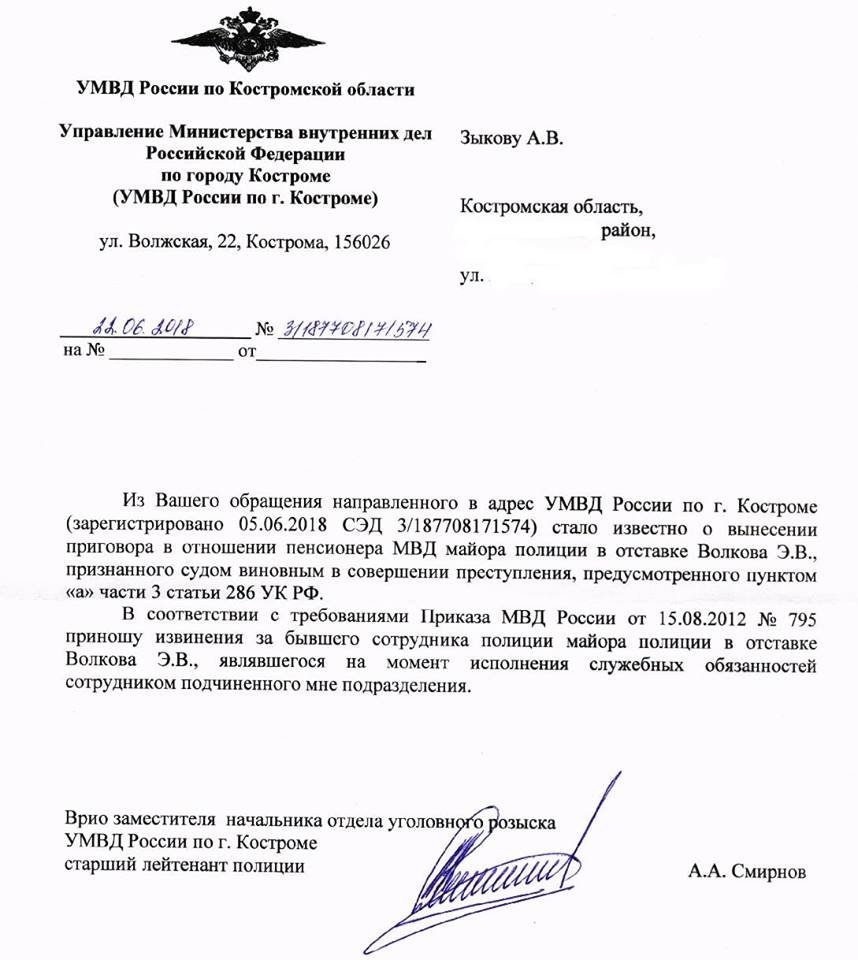 «Несмотря на то, что Зыков просил принести ему именно публичные извинения, так как незаконные действия Волкова „негативно отразились на образе костромской полиции“, полицейские извинились перед молодым человеком ответом на обращение», — говорится в сообщении фонда.