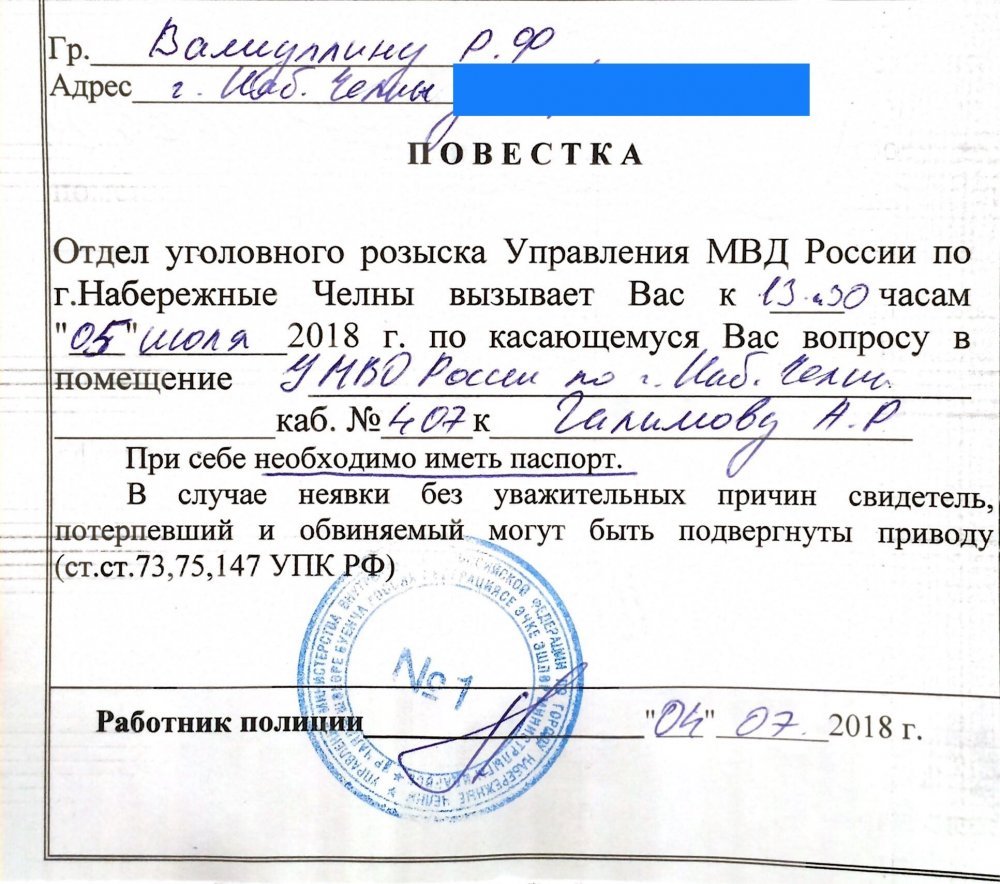 По словам Валиуллина, он сообщил о повестке дежурному прокурору, так как в ней не указан его статус, для чего его вызывают и по какому делу.