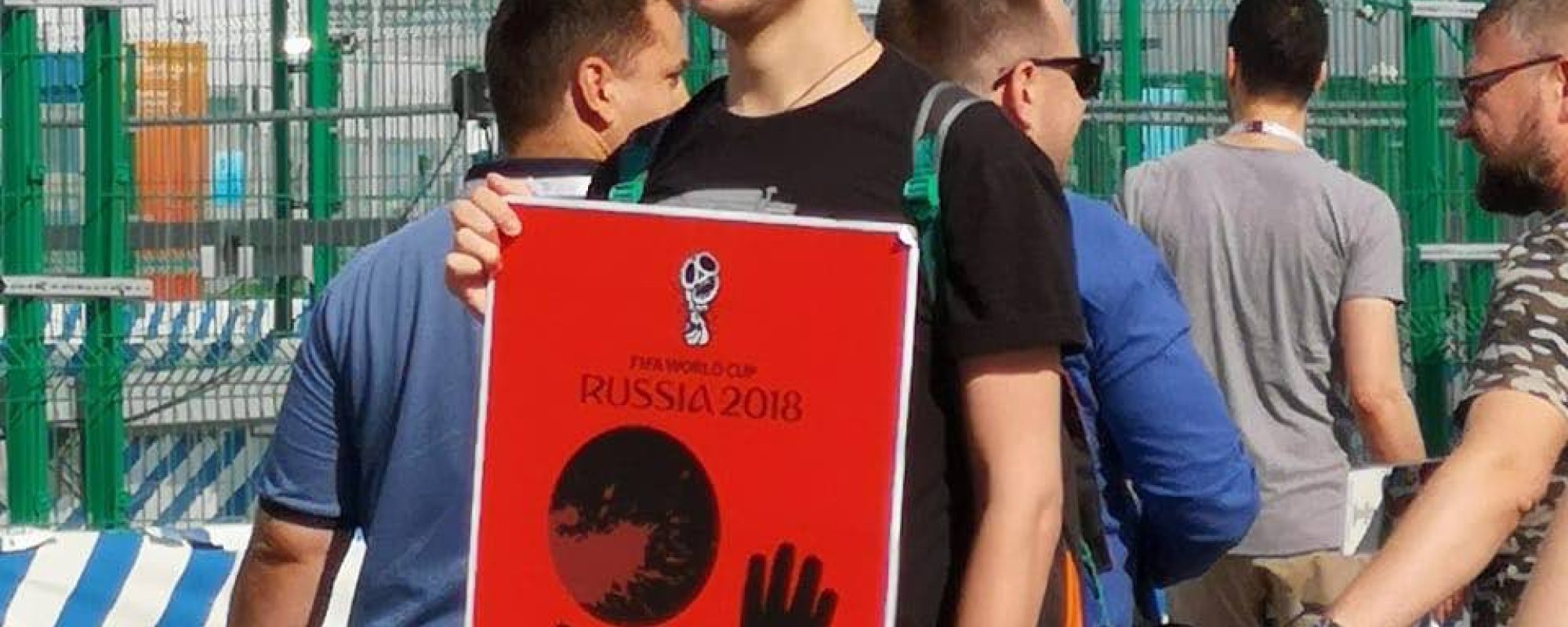 Пикетчик стоял с рисунком украинского художника Андрея Ермоленко, критикующим Чемпионат мира по футболу.