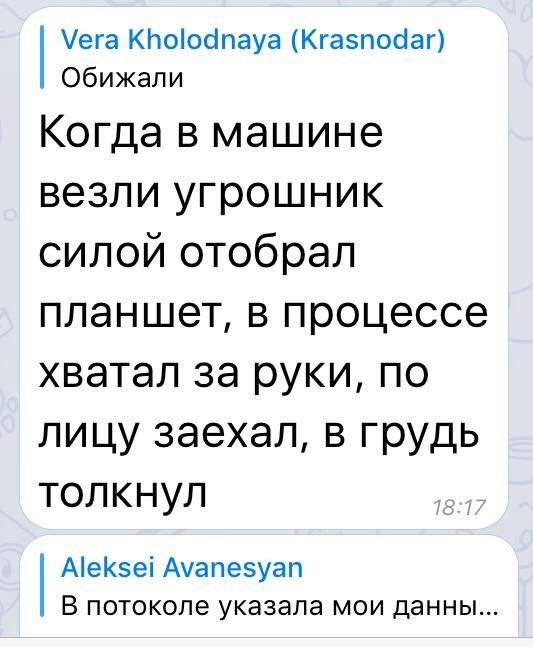 UPD 6 сентября 08:20 Адвокат Алексей Аванесян опубликовал на фейсбуке фрагменты переписки с Холодной, где она рассказывала, что во время задержания сотрудник угрозыска применял к ней насилие.