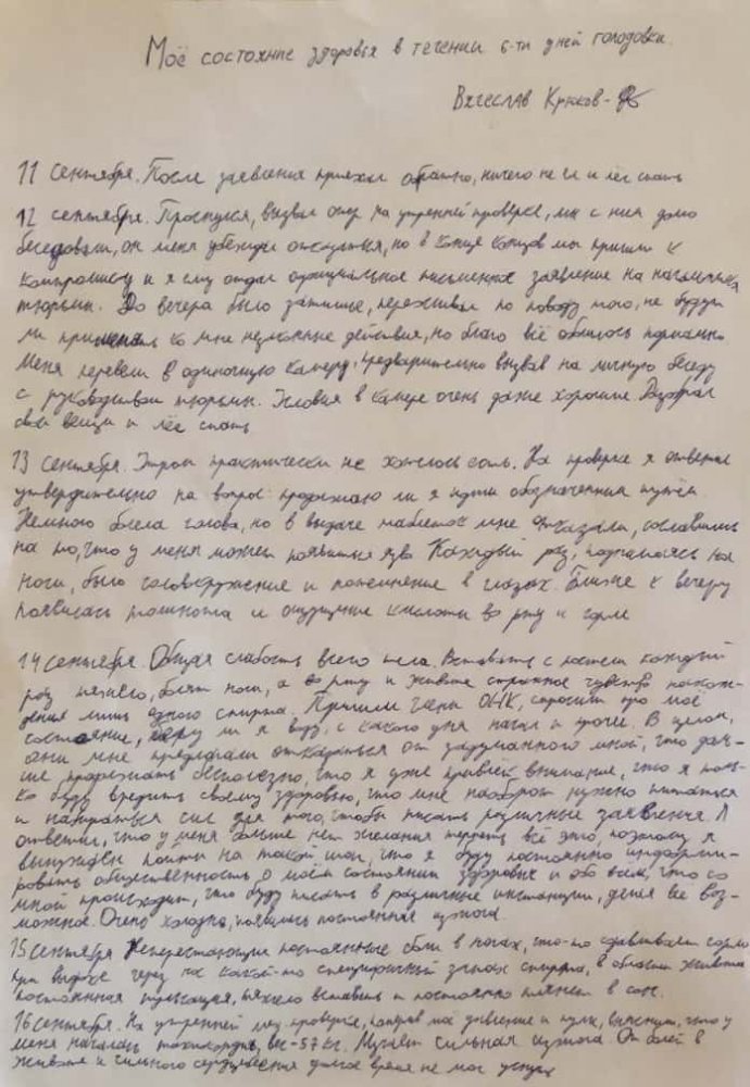 Через своего адвоката Вячеслав Крюков передал члену общественной наблюдательной комиссии описание состояния здоровья в течении 5 дней голодовки.