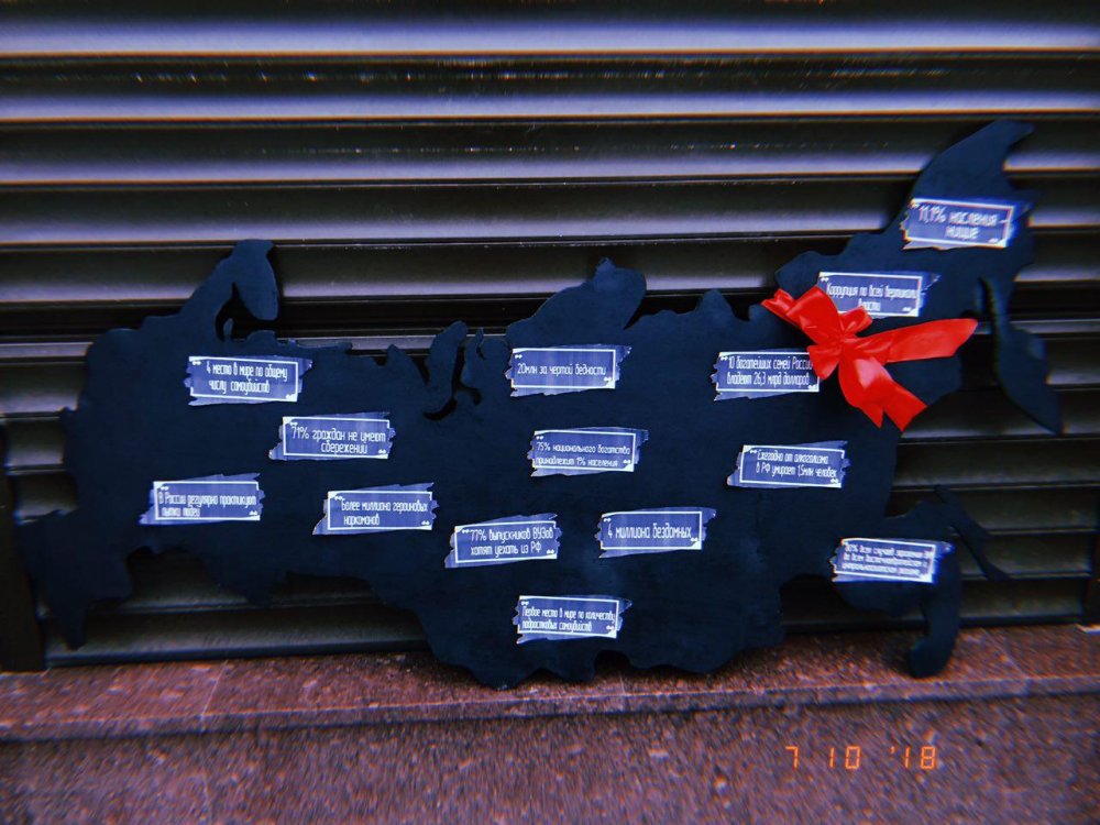По словам Афанасьевой, для акции активисты вырезали из фанеры контур России и наклеили на нее «всякие факты». Например, «1 миллион героиновых наркоманов».