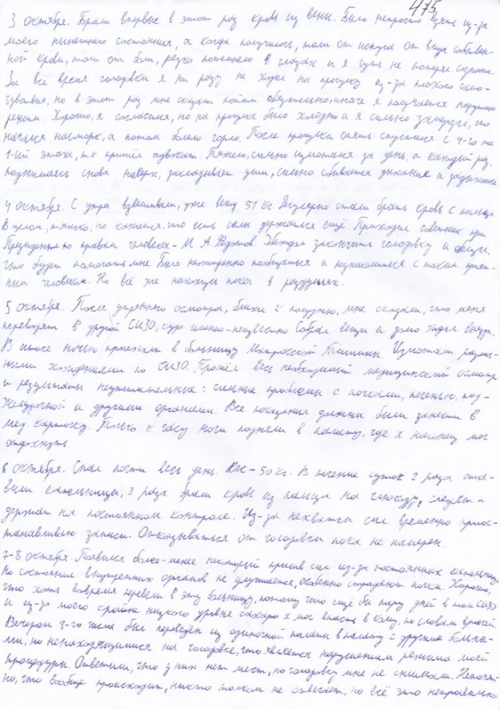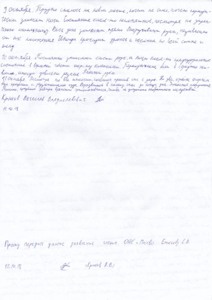 Еникеев опубликовал заметки Крюкова о своем состоянии в последние дни. В них он рассказывает о проблемах с почками, печенью, поджелудочной железой. По словам обвиняемого, он достиг веса в 50 килограмм. У него немеют кисти рук, периодически появляются резкие боли в животе.