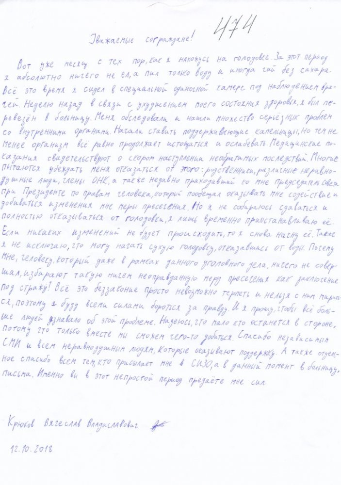 Крюков написал заявление для общественности, в котором объяснил свое решение. По словам юноши, у него обнаружили множество серьезных проблем со внутренними органами. Крюкову ставили поддерживающие капельницы, но организм продолжал истощаться и ослабевать. По мнению врачей, дальнейшее продолжение голодовки приведет к необратимым последствиям.
