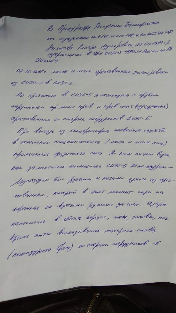 Вахитов написал жалобу в прокуратуру Башкортостана, где подробно описал происходящее с ним и другими осужденными по прибытии в СИЗО № 5.