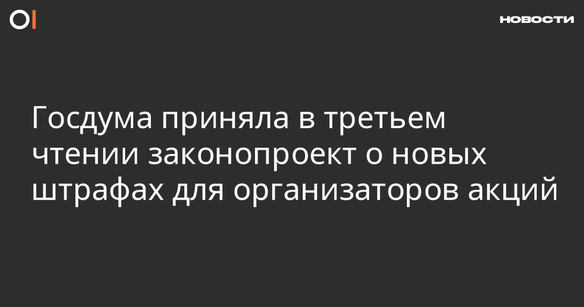 Государственная дума приняла в третьем чтении законопроект о новых штрафах в случае, если организатор публичного мероприятия не уведомил власти о его отмене или подал уведомление без цели проведения акции. Об этом сообщается на сайте о деятельности Госдумы.