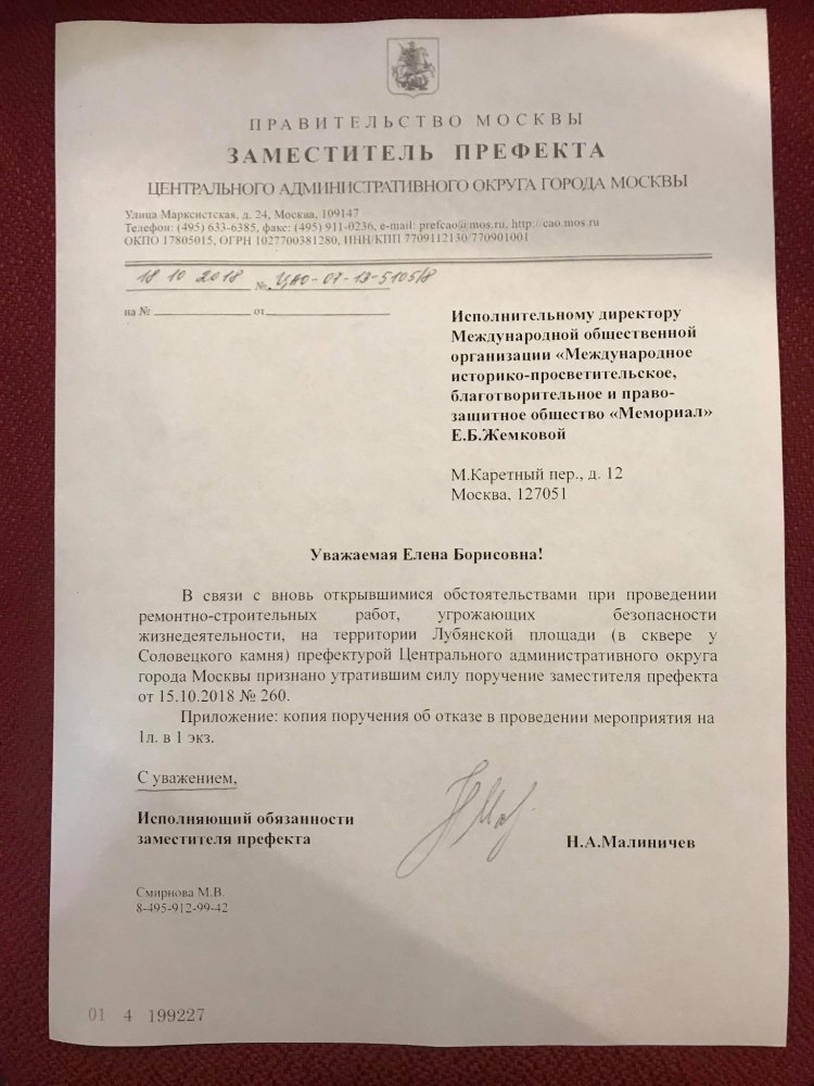 UPD 20 октября На странице Международного «Мемориала» в фейсбуке сообщили, что организаторам «Возвращения имен» позвонили из мэрии Москвы и позвали на встречу к Соловецкому камню для обсуждения согласования акции. В «МБХ медиа» также написали со ссылкой на учредителя фонда «Вера» Нюту Федермессер, что мэрия согласилась организовать проход граждан к памятнику в день акции.