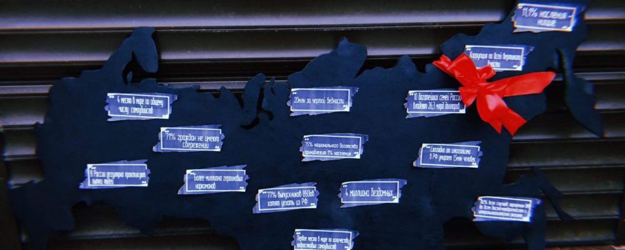 - Валерия Вохмина, Полину Сизову и еще одного молодого человека задержали 7 октября у Администрации президента. Они провели акцию, посвященную дню рождения Путина: для этого активисты, по словам координатора «Весны» Надежды Афанасьевой, вырезали из фанеры контур России и наклеили на нее «всякие факты». Например, «1 миллион героиновых наркоманов».