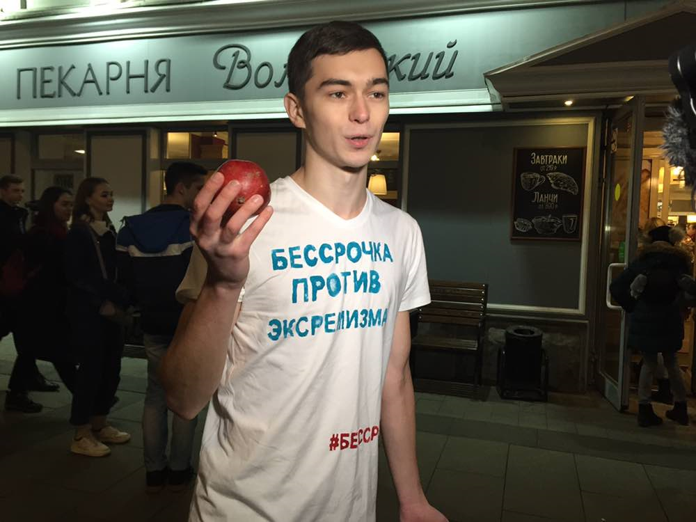 Во время акции участники «бессрочного протеста» надели футболки с надписью «Я не экстремист» и «Бессрочка против экстремизма». В них они безвозмездно раздавали прохожим плоды граната и конфеты, которые находились в бутылке.
