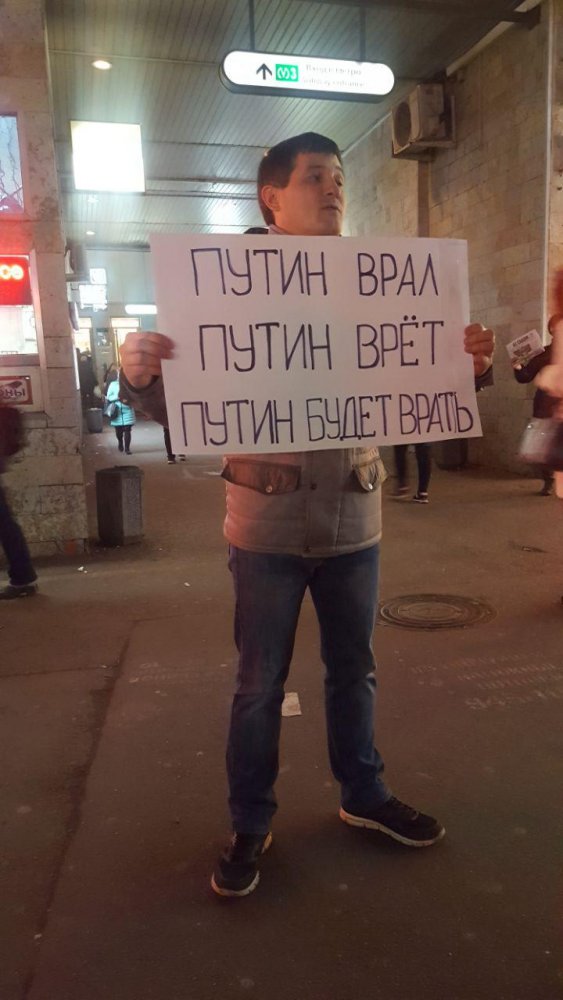 В Петербурге задержали сторонника «Бессрочного протеста» Евгения Мусина, когда он стоял в одиночном пикете с плакатом «Путин врал Путин врет Путин будет врать». Об этом Мусин сам сообщил ОВД-Инфо.