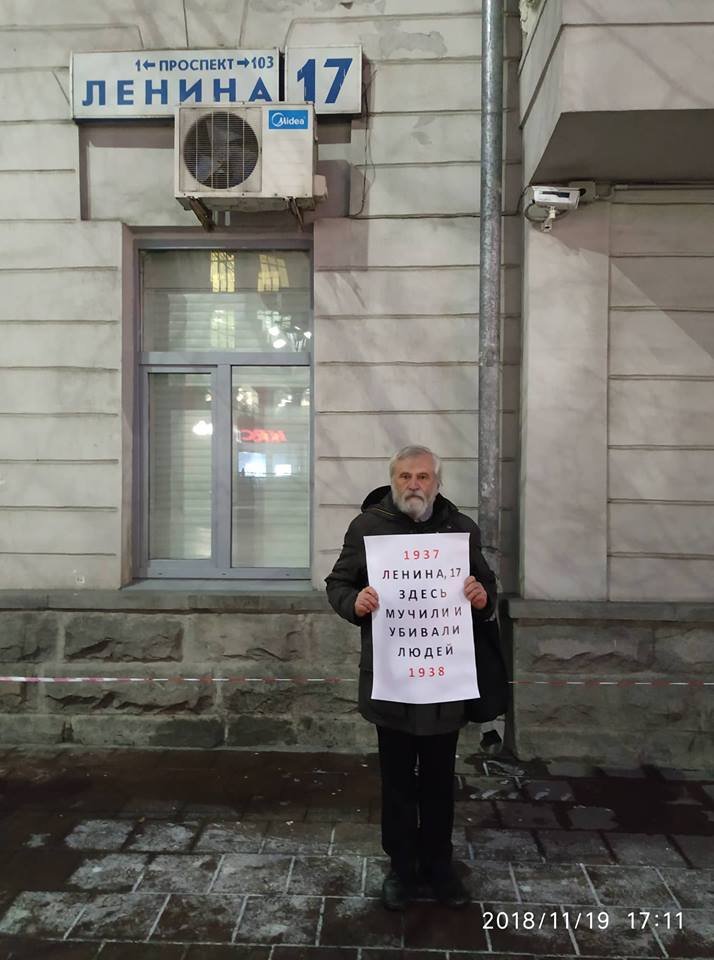 Мосин стоял с плакатом «Ленина, 17. Здесь мучили и убивали людей». Он требует установить на здании мемориальную табличку в память о репрессированных. После задержания Мосина завели внутрь здания, где он написал объяснение для Центра «Э». Затем историка отпустили, и он продолжил пикет.