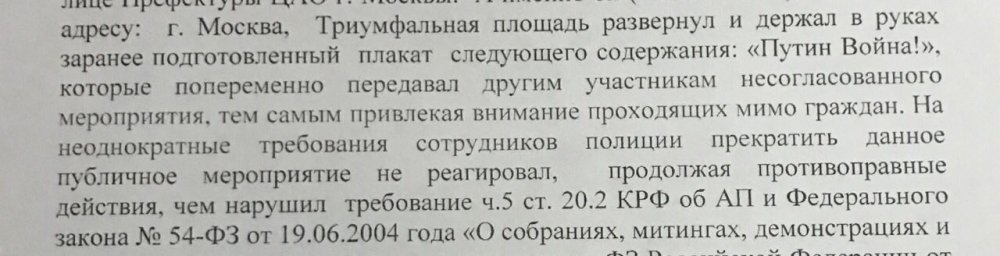 Согласно протоколу, Ожич «развернул и держал в руках заранее подготовленный плакат следующего содержания: „Путин. Война!“, которые попеременно передавал другим участникам несанкционированного мероприятия, тем самым привлекая внимание проходящих мимо граждан». По мнению правоохранителей, активист «на неоднократные требования сотрудников полиции прекратить данное публичное мероприятие не реагировал, продолжая противоправные действия».