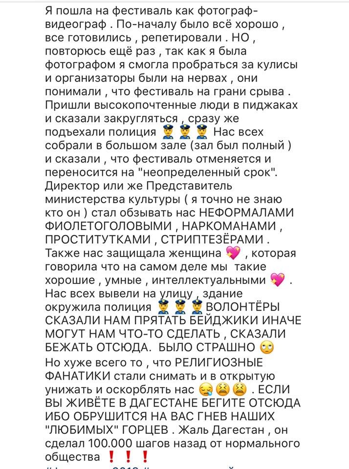 Так, Анохина опубликовала скриншот со страницы дагестанского шоумена Эльдара Иразиева в Instagram, который выразил недовольство проведением фестиваля. «Буквально в эти часы в Аварском театре города Махачкалы проходит так называемый фестиваль Неформалов (нефоров). Те, кто молчит в протесте против разврата в Дагестане, хавайте дальше, не за горами фестиваль геев и трансвеститов в этом городе», — написал Иразиев в посте, который позже удалил. Анохина считает, что угрозы и оскорбления стали поступать после этого сообщения.