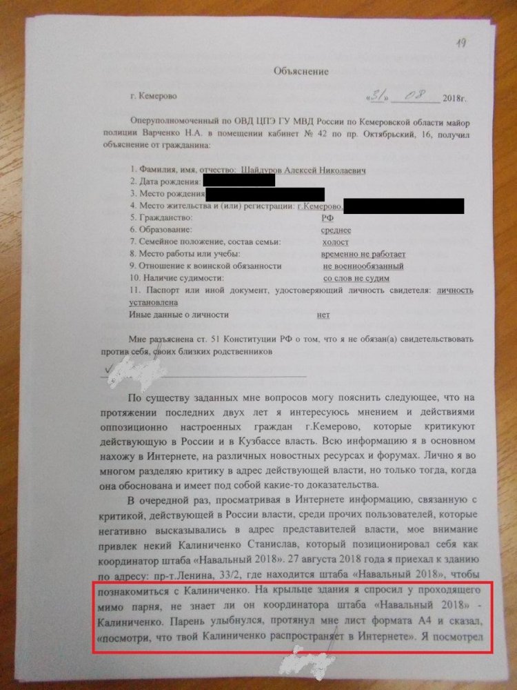 UPD 15:30 Глава федерального штаба Навального опубликовал в твиттере объяснение человека, написавшего заявление на Калиниченко. Согласно этому документу, мужчина хотел познакомиться с активистом и направлялся в штаб.