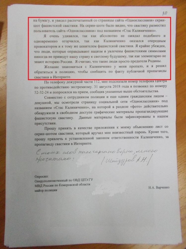 Около штаба он спросил неизвестного, не знает ли тот, где можно найти координатора. Тот в ответ улыбнулся и протянул ему распечатанный скриншот со страницы в «Одноклассниках». При этом мужчина сказал: «Посмотри, что твой Калиниченко распространяет в интернете».