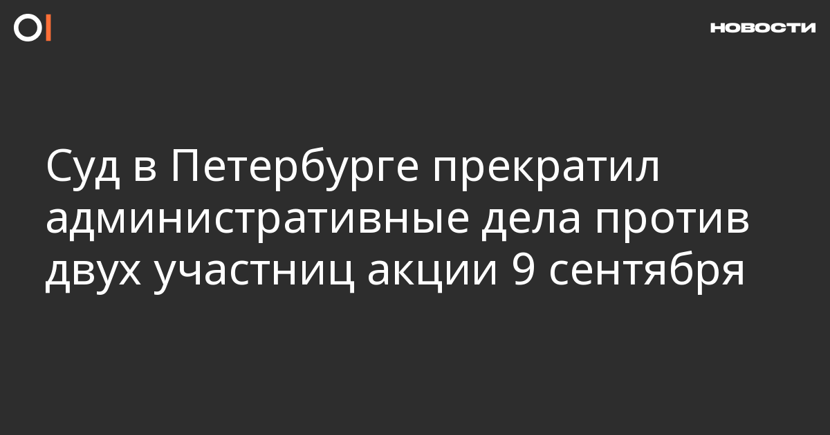 Выборгский районный суд Петербурга прекратил административные дела против Ларисы Липатовой и Ольги Синяковой. Их обвиняли в нарушении правил проведения публичного мероприятия (ч. 5 ст. 20.2 КоАП) на акции против пенсионной реформы, прошедшей 9 сентября. Об этом ОВД-Инфо рассказали в Группе помощи задержанным.
