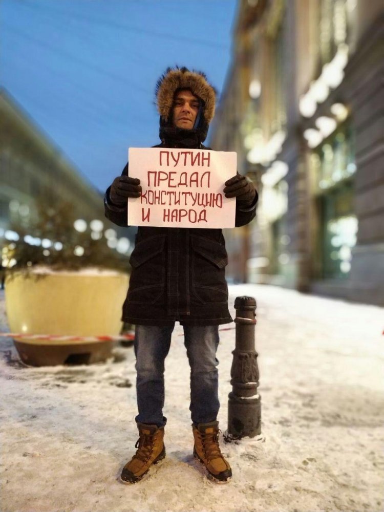 - Активиста уже задерживали накануне, 4 января. Тогда он стоял с одиночным пикетом на Малой Садовой улице. На его плакате было написано: «Вчера Путин отобрал Крым! Сегодня он отобрал твою пенсию! Завтра Путин заберет твою свободу!». Во время задержания силовики объяснили, что на него якобы «пожаловались граждане». После задержания активиста отвезли в 78 отдел полиции, изъяли плакат и отпустили без составления протокола.