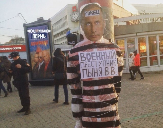 В ноябре 2018 года в Перми к столбу электроосвещения привязали чучело Владимира Путина в тюремной робе с надписями «Лжец» и «Военный преступник Пыня В.В.». Как сообщает «Апология протеста», по версии следствия, «неустановленные лица, выражая явное неуважение к обществу по мотивам политической ненависти или вражды, грубо нарушили общественный порядок».