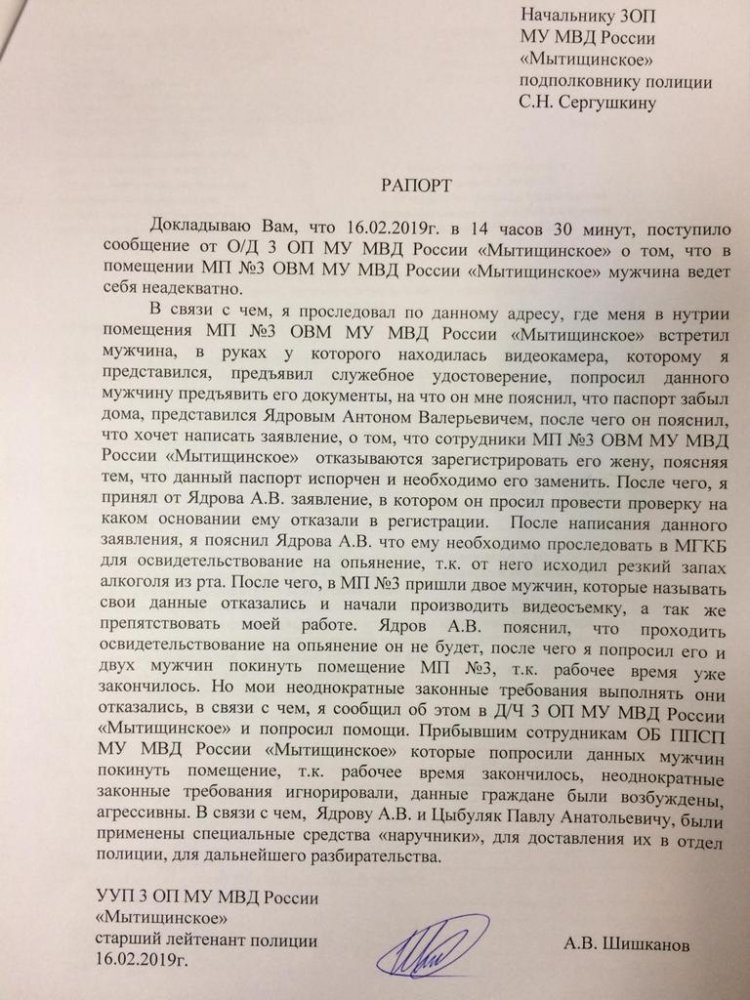 «Далее сотрудница УФМС неожиданно заподозрила Антона Ядрова в алкогольном опьянении и вызвала наряд полиции, — описывает произошедшее Сеньчев. — К этому времени к Антону подъехали коллеги для оказания юридической помощи и защиты. Однако прибывший наряд полиции задержал Ядрова и прибывшего на помощь журналиста „Росдержавы“ Павла Цыбуляка по обвинению в неповиновении законному распоряжению сотрудника полиции».