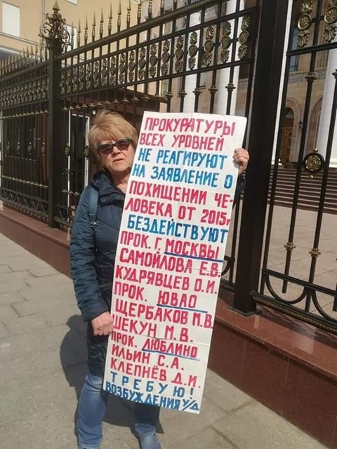 Женщина утверждает, что несколько лет назад ее сына похищали «черные риелторы». Теперь она проводит одиночные пикеты у разных ведомств и требует возбуждения уголовного дела.