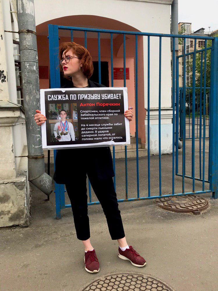 Карпова днем 15 мая стояла возле Военного комиссариата по Тверскому району и держала плакат с фотографией Антона Поречкина — призывника, которого в армии избили до смерти. Во время акции к ней подошли сотрудники полиции и попросили проехать с ней в отдел полиции по Красносельскому району.