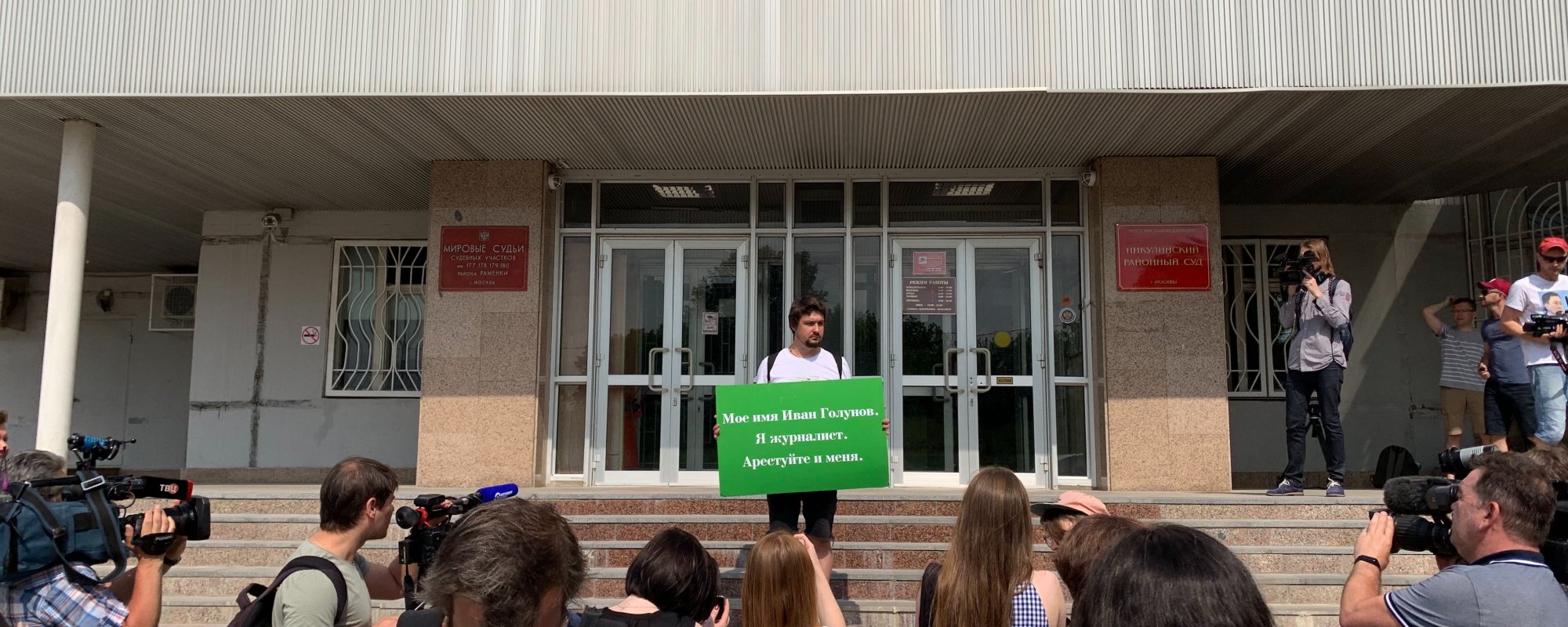 Мужчину задержали из-за того, что он стоял с пикетом рядом со зданием суда. Задержанных доставили в ОВД «Раменское». Все они пришли поддержать журналиста «Медузы» Ивана Голунова, которого задержали 6 июня по подозрению в покушении на сбыт наркотиков. На 14:00 запланировано заседание по мере пресечения.