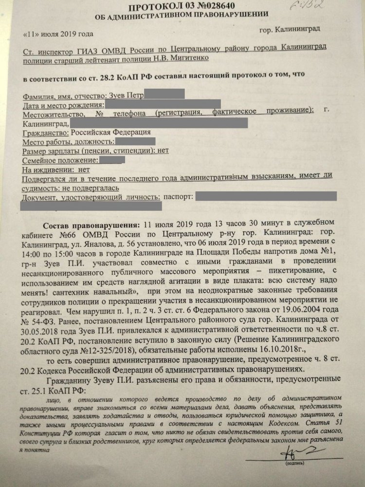 Калининградского активиста Петра Зуева обвиняют по ч. 8 статьи 20.2 КоАП (повторное нарушение установленного порядка проведения публичного мероприятия). Об этом сообщается на странице вконтакте «Команды Навального» в Калининграде.