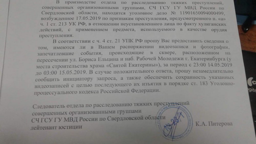 Следственное управление МВД в Екатеринбурге возбудило уголовное дело по пункту «а» части 1 статьи 213 УК (хулиганство с применением предмета, используемого в качестве орудия) в связи с протестами против строительства храма в сквере у театра драмы. Об этом сообщается в телеграм-канале «Апологии протеста».