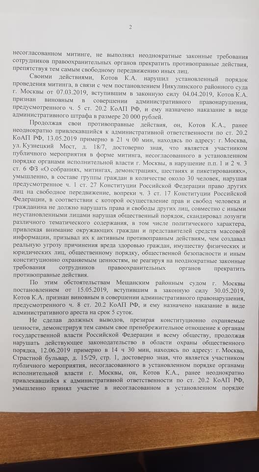 В уточненном обвинении пять эпизодов: помимо задержания на сходе в поддержку Азата Мифтахова, это задержание после схода «В защиту нового поколения» у здания ФСБ 13 мая, задержание на акции в поддержку Ивана Голунова и против фальсификации уголовных дел 12 июня, призыв выйти на Трубную площадь 19 июля в связи с недопуском оппозиционных кандидатов в Мосгордуму и задержание 10 августа во время прогулки после митинга за честные выборы.
