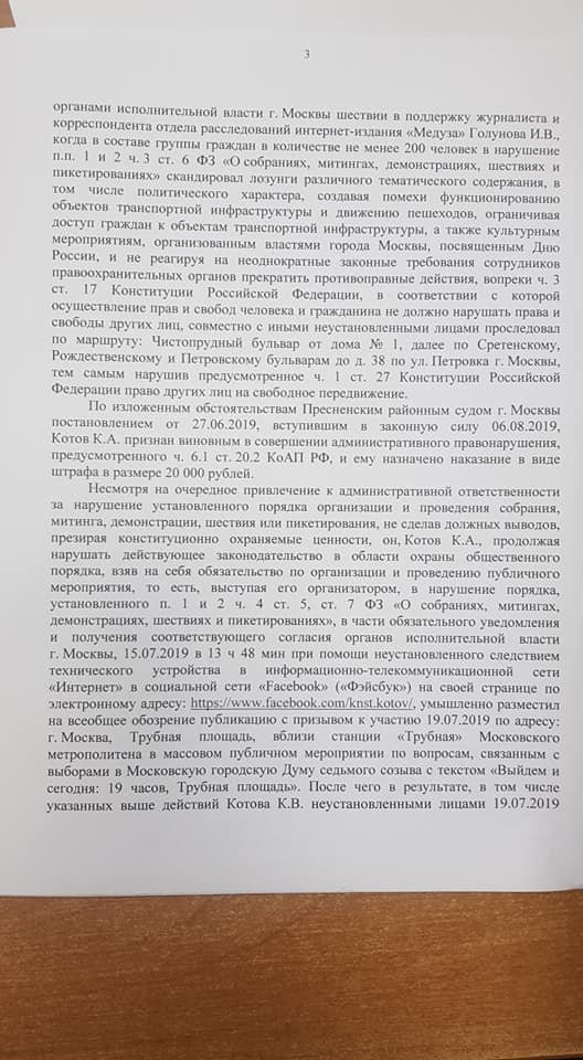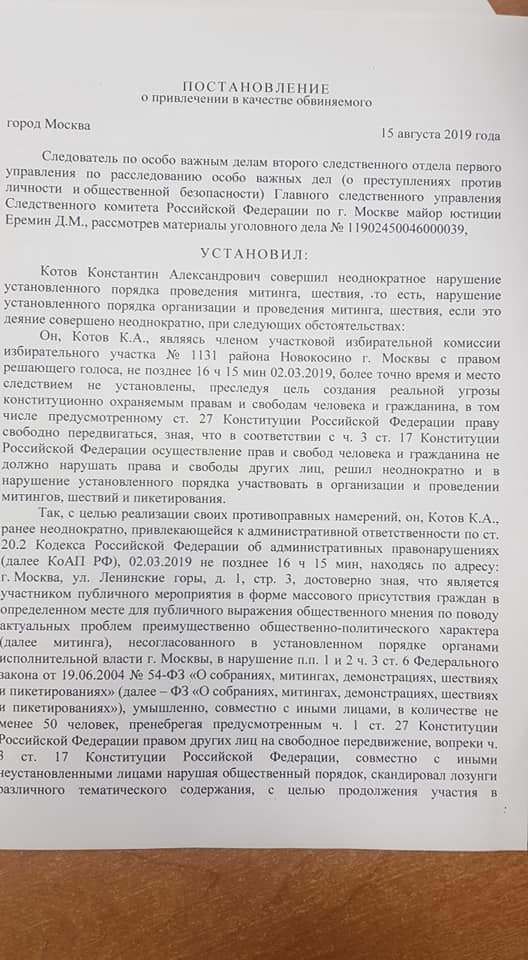 15 августа следствие уточнило Котову обвинение. В деле появился еще один эпизод: задержание 2 марта 2019 года на сходе в поддержку Азата Мифтахова, обвиненного в причастности к нападению на офис «Единой России».