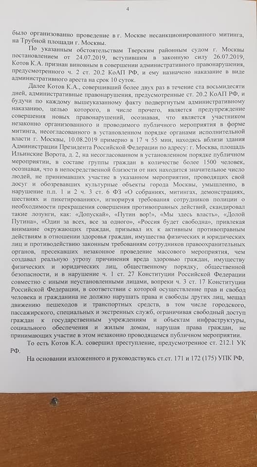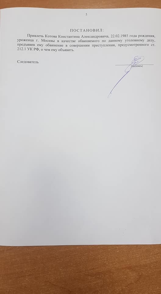 Котова задержали вечером 12 августа, через несколько часов после того, как его отпустили из отдела полиции под обязательство о явке для составления административного протокола. В ночь с 12 на 13 августа ему предъявили обвинение по статье о неоднократных нарушениях порядка проведения публичных мероприятий (ст. 212.1 УК). 14 августа Пресненский районный суд отправил его под стражу. Это первый случай, когда суд помещает под стражу обвиняемого по «дадинской» статье.