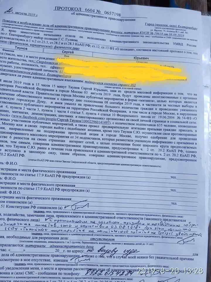 «Кроме того, Тиунов С.Ю., осуществляя свои противоправные действия, направленные на поддержание протестной активности в городе Москве, получил одобрение для проведения несанкционированного массового мероприятия от 34 подписчиков, которые разместили указанную информацию с призывами в количестве 6 репостов на своих страницах интернет-сетей», — указывают полицейские в протоколе Тиунова.
