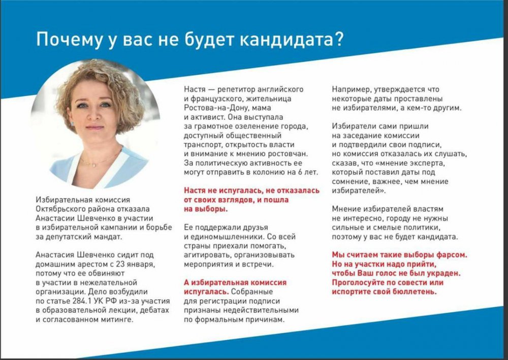 - Избирательная комиссия Октябрьского района 6 июля отказалась регистрировать Анастасию Шевченко в качестве кандидата в депутаты городской думы Ростова-на-Дону. Отказ был связан с жесткими требованиями избирательного законодательства к людям, находящимся под домашним арестом.