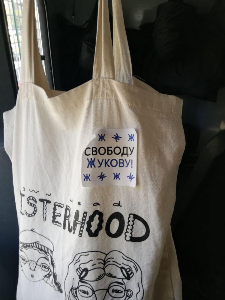 После этого их и корреспондентку DOXA Татьяну Колобакину отвели в автозак. У Колобакиной на сумке была небольшая наклейка «Свободу Жукову».