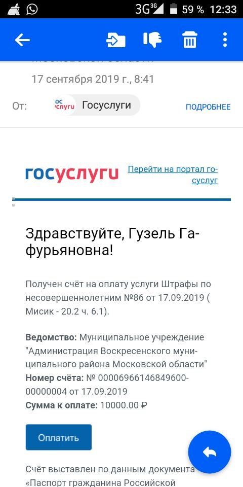 В аккаунте на Госуслугах Гузель Гафурьяновна, мать Ольги Мисик, обнаружила, что 17 сентября ей был отправлен счет на оплату штрафа в 10 тысяч рублей по части 6.1 статьи 20.2 КоАП (участие в несогласованном мероприятии, повлекшем создание помех инфраструктуре).